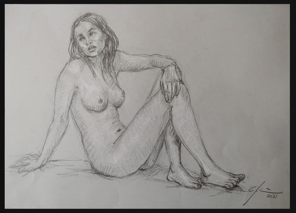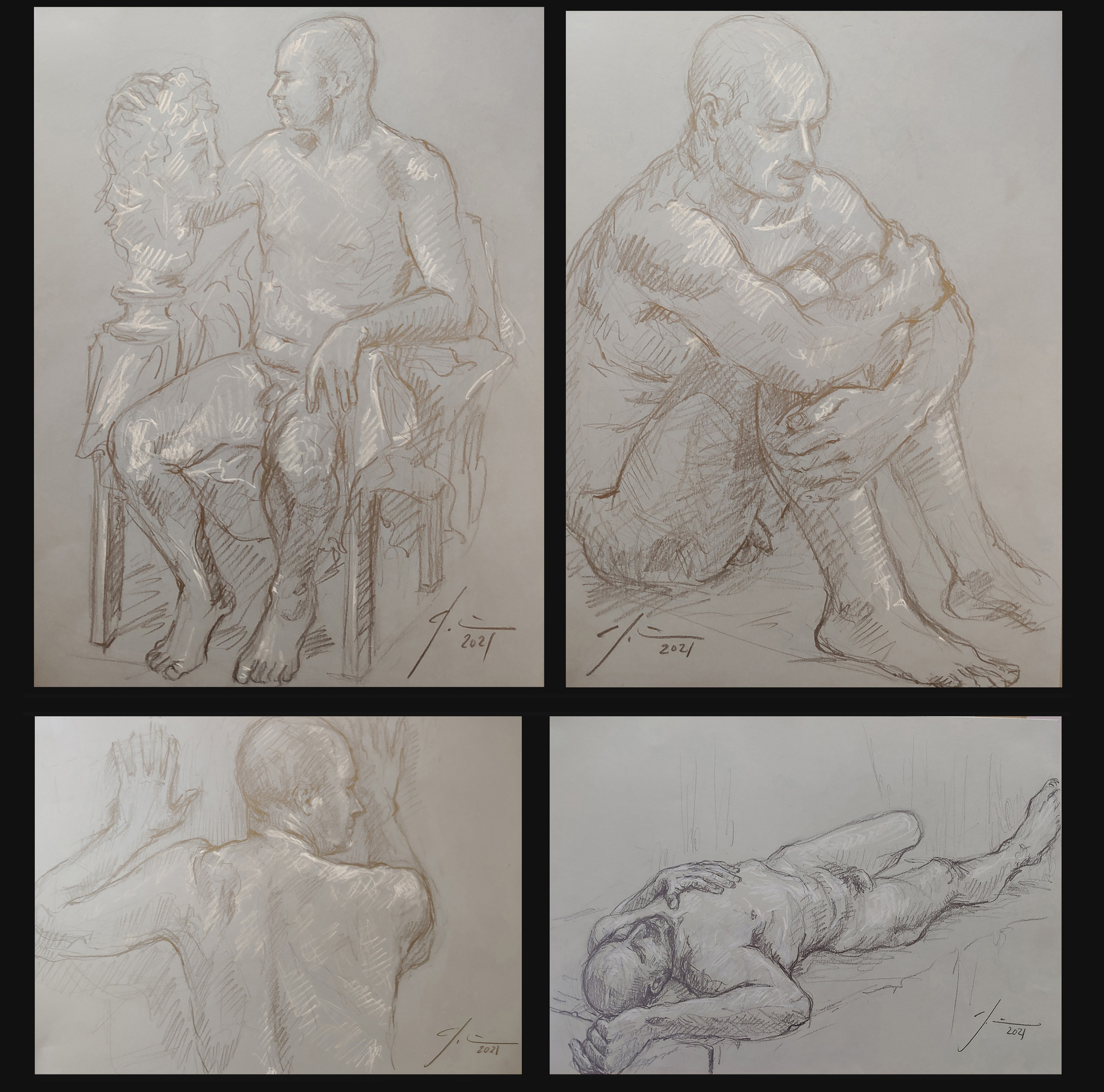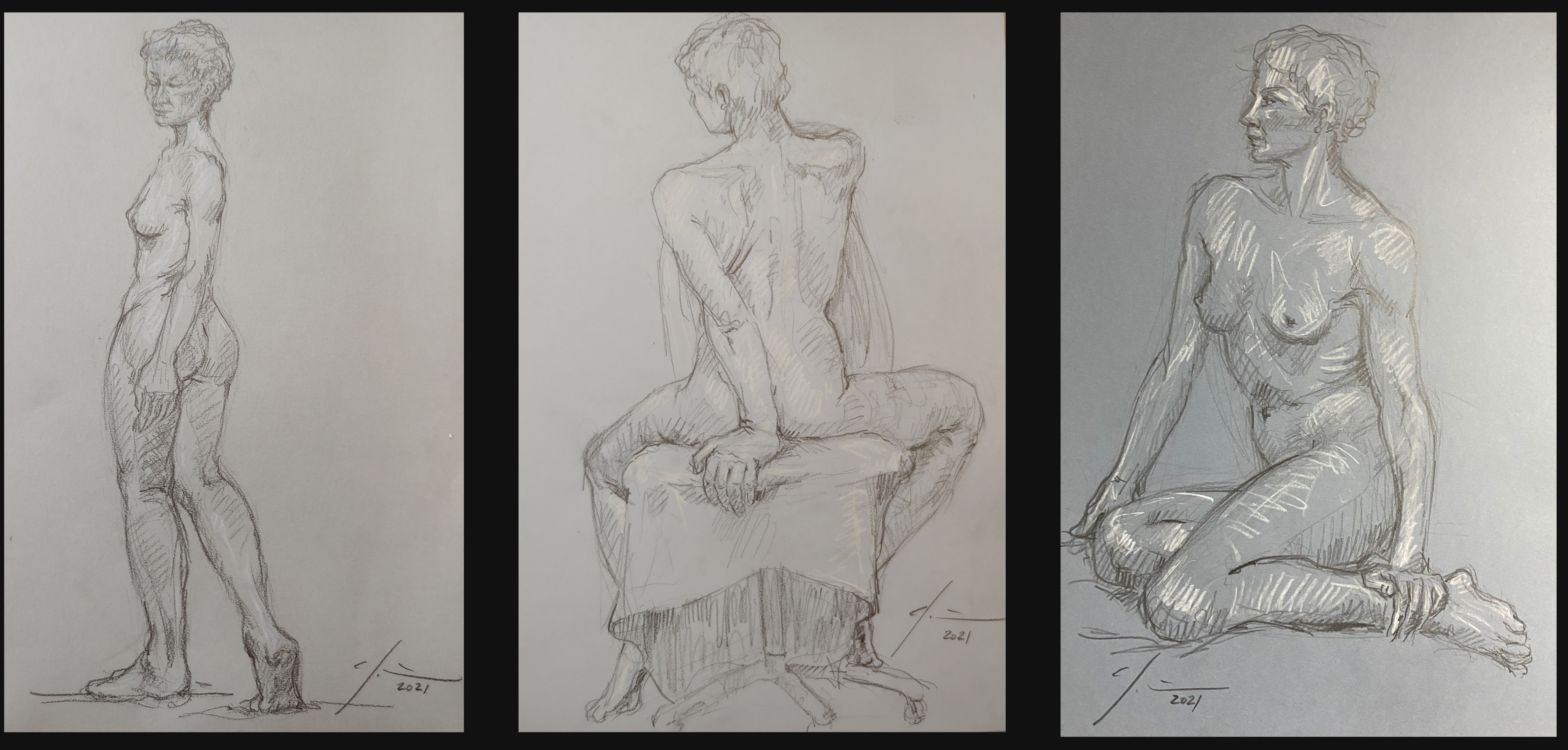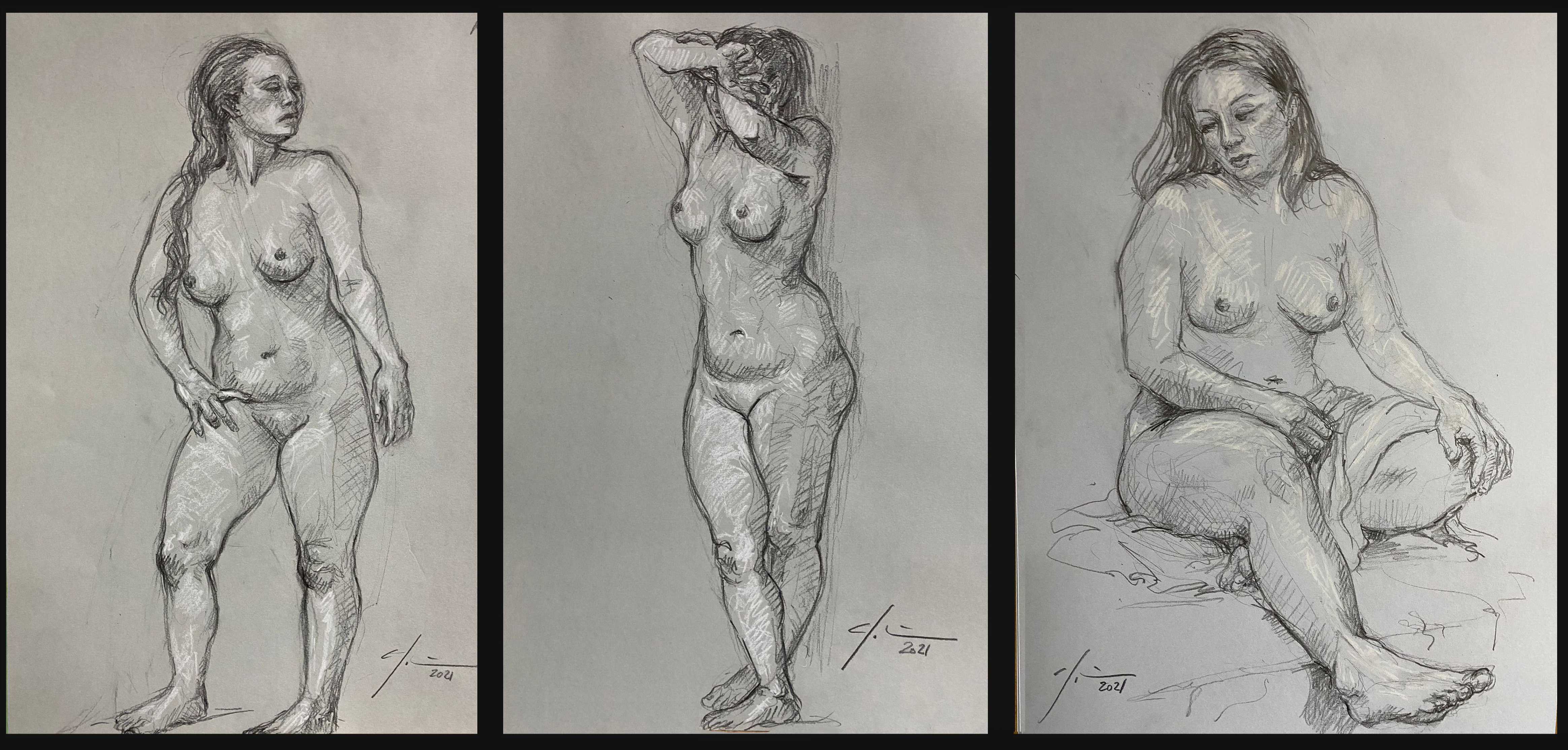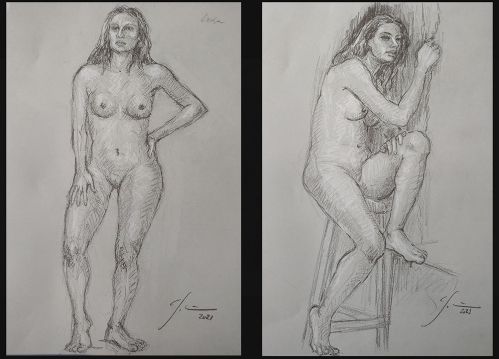Retratos de niñas y mujeres, en diferentes edades y razas y dibujos de desnudos a tinta y lápiz.